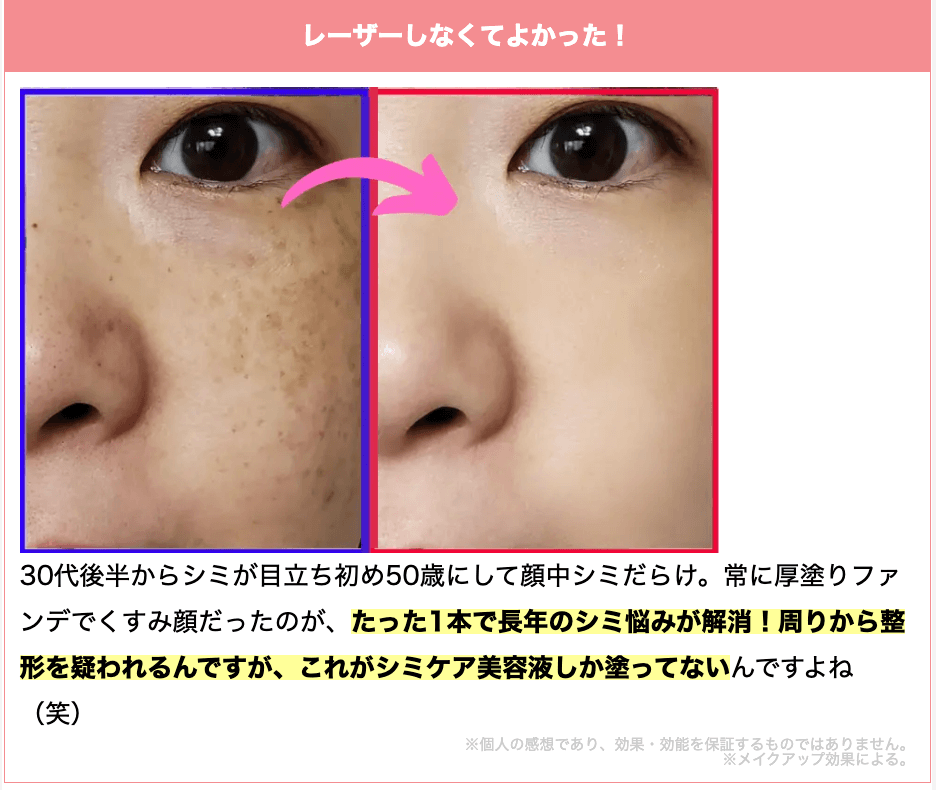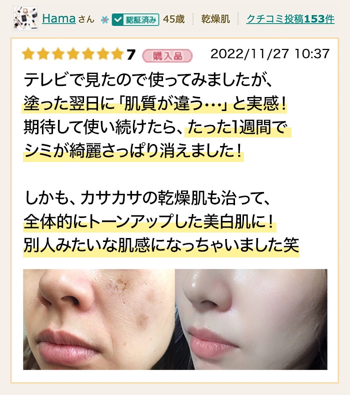 兄嫁から教えてもらって使った所、びっくりするぐらいシミ肌が綺麗になってお肌がプルプルに😳まさかこの年齢でノーファンデ肌になれるんて感動してます!