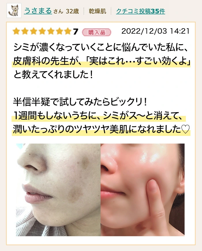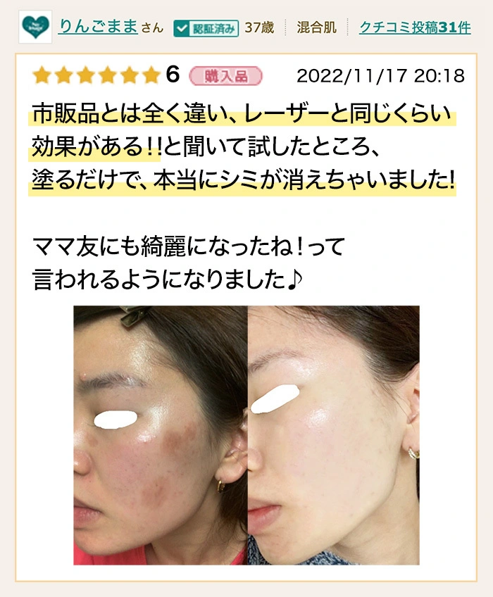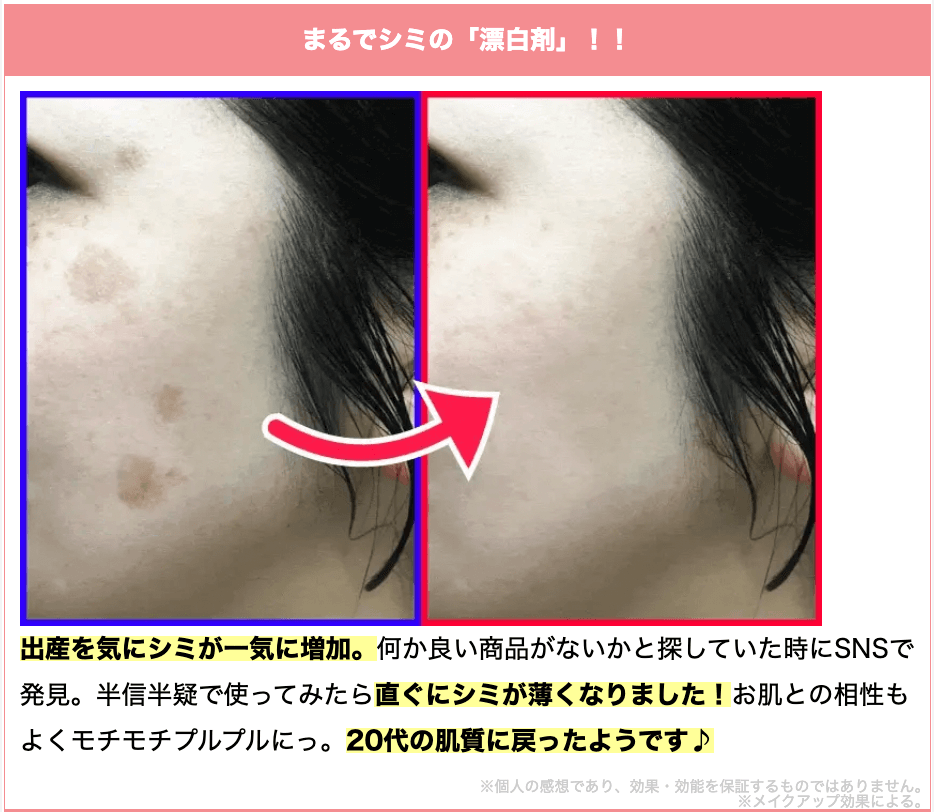 兄嫁から教えてもらって使った所、びっくりするぐらいシミ肌が綺麗になってお肌がプルプルに😳まさかこの年齢でノーファンデ肌になれるんて感動してます!